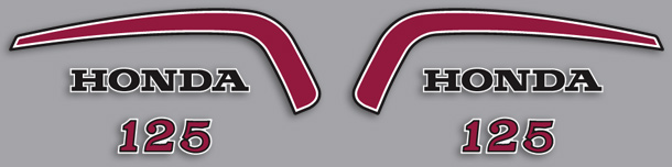 6 piece set Includes: - Fuel tank stripes - Fuel tank HONDA decals - Side panel "125" decals Black stripe on top of fuel tank must be painted. |
