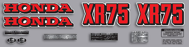 12 Piece Decal Set Includes: 2 - HONDA Gas Tank decals 2 - XR75 Side Panels decals 1 - Honda Motor Co. decal 1 - Preserve Nature decal 1 - Read Owner's Manual decal 1 - Exhaust Modification decal 1 - Tire Info decal 2 - 116 Showa Shock decals 1 - Air Filter Caution decal |